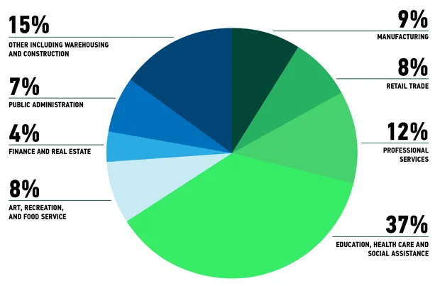 这些城镇的经济不再以制造业为主导。随着工厂工作的减少,教育、医疗保健和社会援助工作特别成为增长的就业来源。然而,这些往往是低技能、低工资的工作。