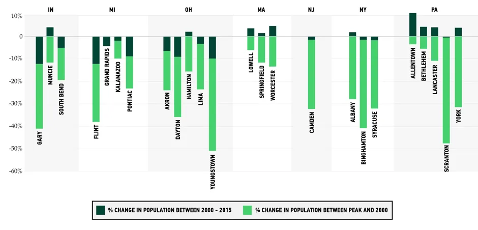 人口下降仍然是小型遗留城市面临的障碍。研究中约一半的城市在2000年至2015年间继续失去人口;另一半则保持大致稳定,甚至有所增长。俄亥俄州的扬斯敦和密歇根州的弗林特,自2000年以来人口几乎减少了50%,是研究城市中表现最差的城市之一。