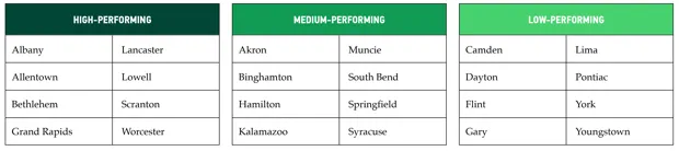 霍林斯沃斯和戈贝尔将24个研究城市分为高、中、低表现类别。