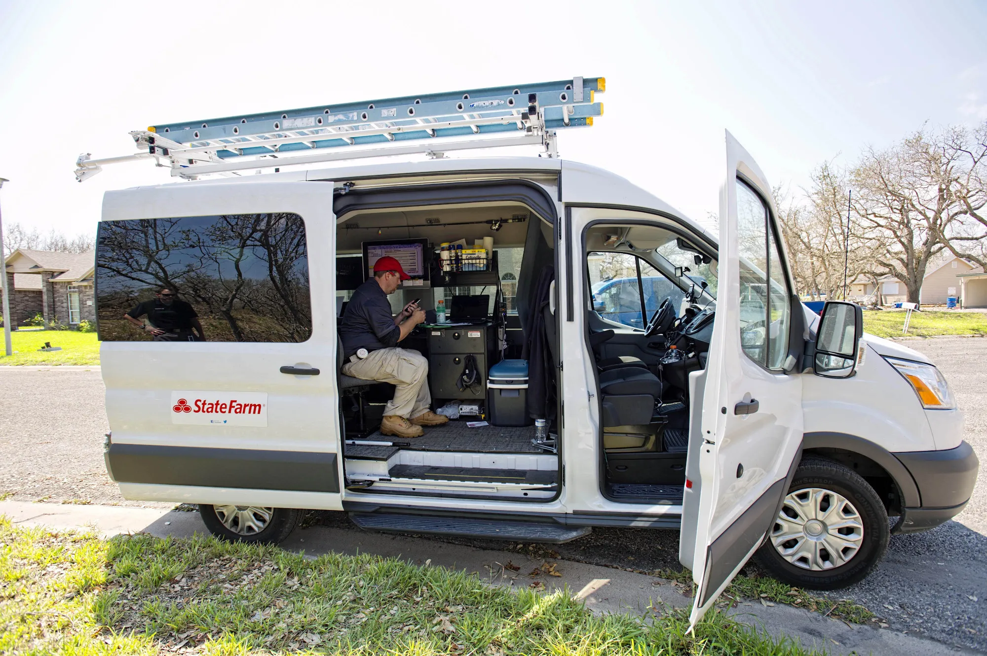 白色福特Transit是Reeves的移动办公室,配备了旋转椅、台式机和笔记本电脑、打印机、橡胶和屋顶靴、膝高靴、装满佳得乐的冷却箱、一袋牛肉干、两瓶驱虫剂,以及在罕见的慢时刻用的两根钓鱼竿。