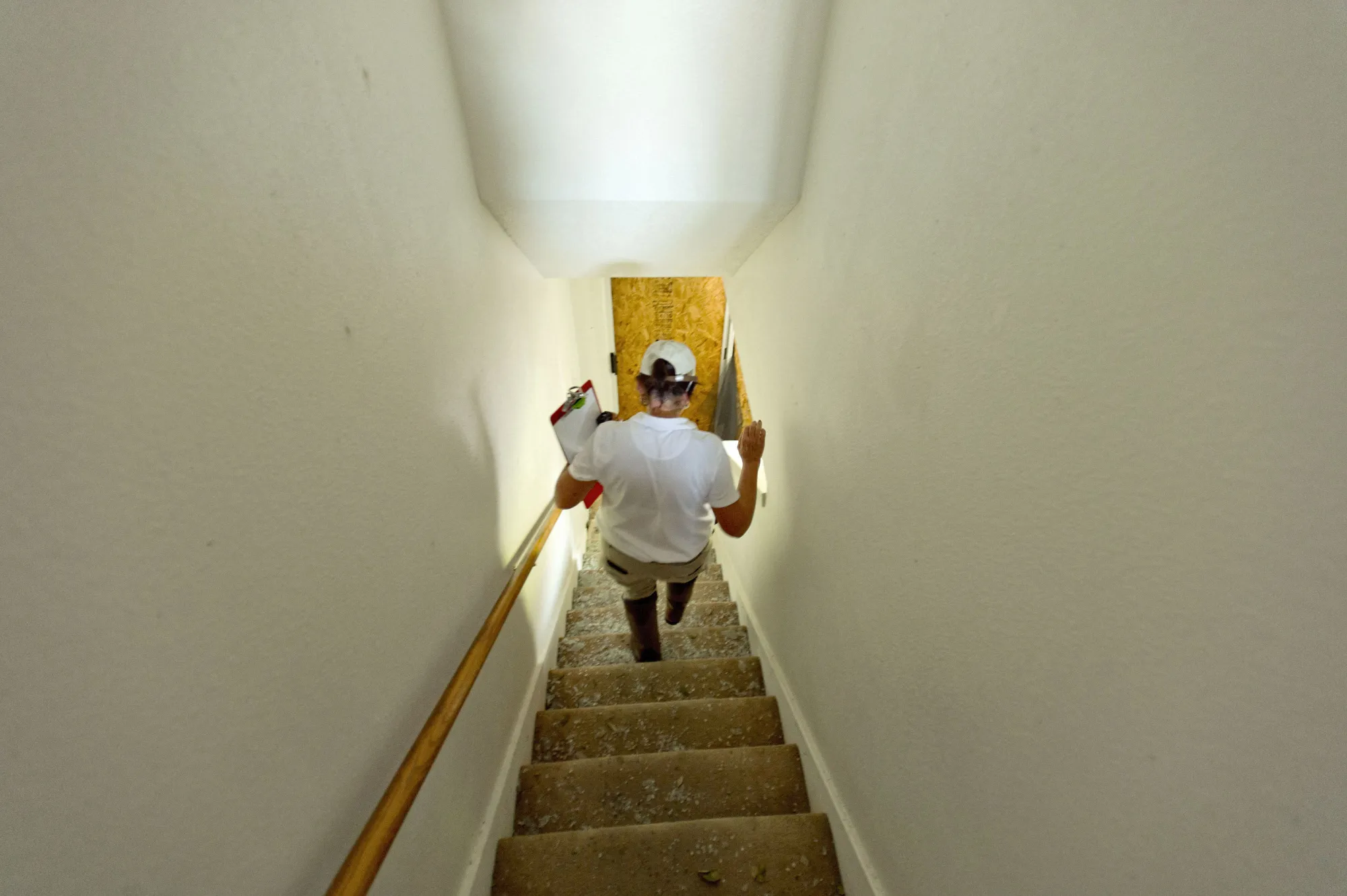 德克萨斯州罗克波特的一名州农保险理赔员在9月2日的洪水受损房屋内。