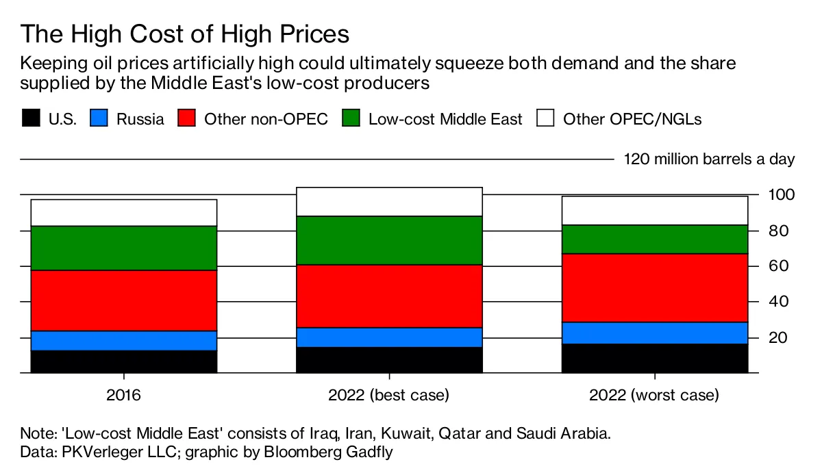 在本周末发布的一份报告中,能源经济学家菲尔·维尔格分析了石油市场的两种情景:一种是中东低成本石油生产者的“最佳”情况,他们最大化生产并让价格暂时下跌;另一种是“最差”情况,他们不断试图操纵价格上涨。后者预计到2022年,他们的集体市场份额将从25%降至16%——而需求几乎没有增长。