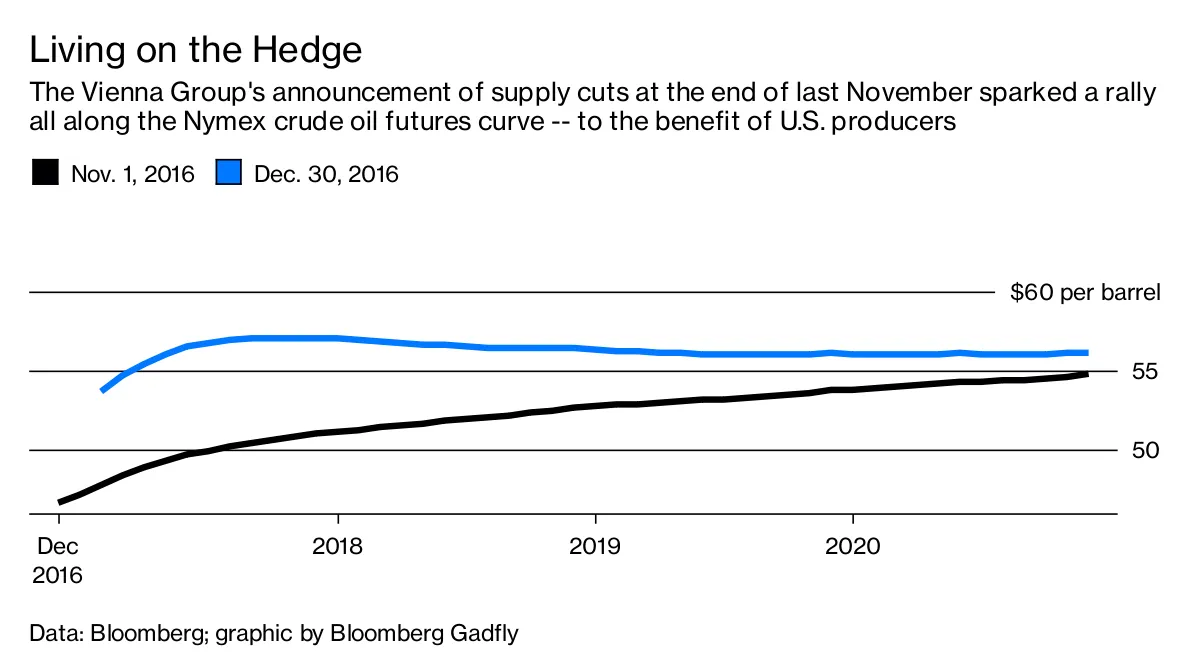 此外,那些关于继续减产的暗示所剩的任何修辞力量,往往会倾向于竞争对手,特别是寻求对冲未来产量的美国勘探和生产公司。维也纳集团最初公告未能持续推高油价的一个重要原因是,它引发了期货价格的初步上涨,使得 对冲狂潮 在勘探和生产公司中得以维持,保持他们的参与: