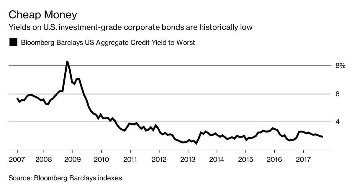当然,这种情况已经持续了一段时间,这些证券仍然是避风港,自2008年以来年化回报超过6%,根据彭博巴克莱指数数据。即使这些衍生品的价格似乎也没有表明投资者正在为全面市场崩溃,甚至部分崩溃做准备。但是随着 厄尔玛飓风朝佛罗里达州逼近,可能造成的损害甚至超过卡特里娜飓风,以及华盛顿在最基本问题上的争吵,投资者开始感到有些不安也就不足为奇了。当然,还有对与朝鲜紧张关系升级的恐惧,这可能会恶化美国与中国之间的贸易关系,导致经济受到影响。“地平线上有可能导致市场失衡的事件,”花旗集团的信用衍生品策略师阿宁迪亚·巴苏说。“你会看到这种情况传导到市场。”现在,任何紧张情绪只会帮助高评级债券,投资者纷纷涌入这些债券以避开地缘政治和自然风暴。但显然,一些投资者正在为这种情况的变化做准备。