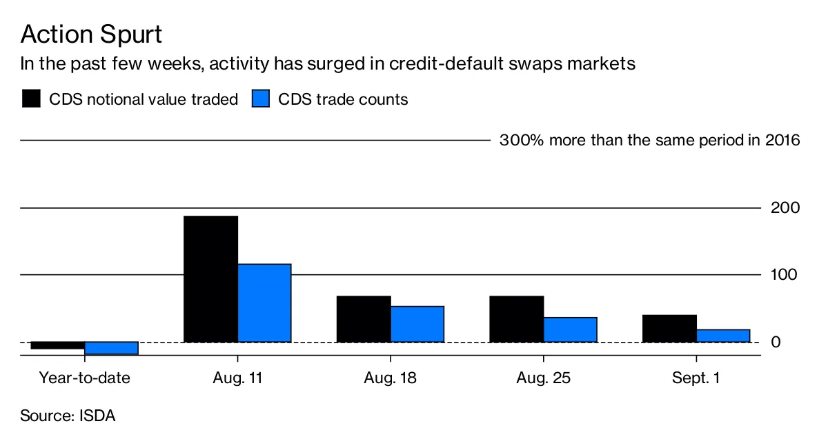 是的,他们仍在向这笔债务注入资金,并接受接近历史低点的收益率来拥有它。但仔细观察就会发现,这些债券买家开始显露出一些不安的迹象。交易员们越来越多地转向衍生品,以对冲潜在的损失。这与年初时的情况形成鲜明对比,当时许多债券投资者似乎不愿意为了这种保护放弃任何收益。在2017年的大部分时间里,信用违约掉期的交易量远低于近年来的平均水平。然而,现在衍生品的活动急剧上升,与2016年同周相比,截至8月11日的一周交易量激增超过110%。这与2017年整体交易量平均下降超过10%相比形成对比。
