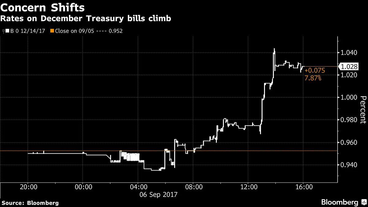 债券交易员关注被推迟的日子债务上限协议确实让大多数——但不是全部——债券交易员感到意外。虽然美国国债在消息公布后出现抛售,但有一组交易员却坐享其成。周二,财政部拍卖了200亿美元的一个月期国库券,利率为1.30%,高于两年期国债的1.23%收益率,债务上限的紧张情绪特别高。那些勇于在这些利率下购买的人看到周三国库券的价值飙升,因为利率降至1.02%。这是四周期国库券的历史性变动,被认为是地球上最安全的投资。可惜,债务上限协议只是将清算日从十月初推迟到十二月的某个时候。因此,那个中旬到期的国库券利率飙升。“这只是把问题推迟了,”杰富瑞经济学家托马斯·西蒙斯告诉彭博新闻的亚历山德拉·哈里斯。