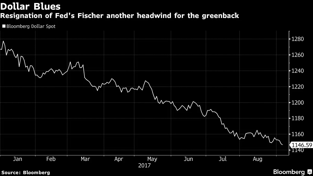 美元贬值的原因众所周知,从华盛顿的功能失调到意外低的通货膨胀率。但即使在美元指数今年几乎下跌了10%之后,牛市的前景也没有好转。最新的打击发生在周三,消息称美联储副主席斯坦利·费舍尔已于十月中旬辞职。这对货币交易者的重要性在于,费舍尔花了很多时间捍卫传统经济模型,这些模型表明,随着失业率下降,通货膨胀应该加速,这也是美联储最近采取鹰派立场的原因。但根据FTN金融经济学家克里斯·洛的说法,在没有费舍尔和任期将于二月结束的主席珍妮特·耶伦的情况下,美联储可能会更加鸽派。