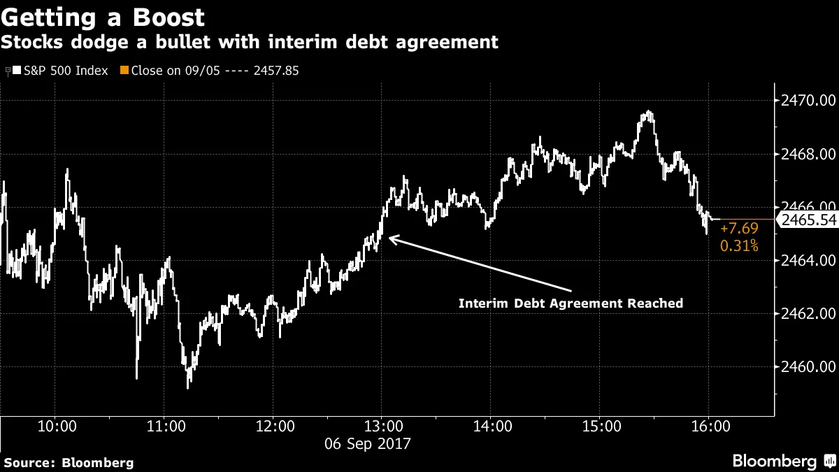 在没有更高利率的前景下,购买美元的动力很小。这解释了为什么尽管地缘政治风险上升,美元最近仍然如此疲软。根据摩根士丹利的外汇策略师的说法,美元不再像避风港。相反,它正在追踪已经下降的国债收益率。根据其模型,美元对债券波动的敏感性是自1990年代末以来的最高水平。值得注意的是,即使在特朗普总统支持民主党在飓风救助法案中增加三个月的债务上限和政府支出的消息后,彭博美元现货指数仍未能收高。股票躲过一劫,但更多挑战在前临时的债务上限解决方案和对哈维的援助给投资者带来了第一个真正的迹象,表明华盛顿并非如此功能失调,而且共和党和民主党可以合作。这个消息确实给股票带来了冲击,标准普尔500指数达到了当天的高点。美国银行美林证券认为,投资者应该对股票更加自信。该公司在周三的一份研究报告中表示,考虑到自2007年以来全球经济的首次同步上升是盈利的强劲助力,建议看涨。根据该公司的估算,全球企业利润比去年高出13.5%。这与基准的MSCI全球国家指数的涨幅一致,表明股价并没有过于高估。当然,前方还有许多其他问题需要担忧,包括飓风哈维和可能的飓风厄玛对美国经济的潜在拖累、美国债务上限问题仅被推迟到十二月,以及中央银行讨论撤回其非常规刺激措施。