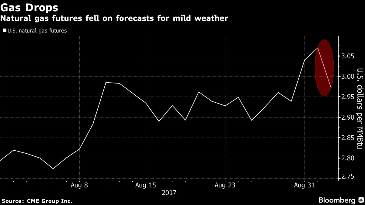 天气“三重奏”惩罚天然气根据彭博新闻的瑞安·柯林斯的说法,天气对美国天然气多头没有任何好处。未来几天,较凉的气温将蔓延到美国部分地区,削弱对发电燃料的需求。厄玛在周二增强为五级飓风,可能会延长这种情况,同时威胁到佛罗里达州的电力服务——以及天然气需求——在本周晚些时候。根据当前模型,它可能会让墨西哥湾免受影响,那里天然气钻探者正在从哈维飓风中恢复。“现在你对墨西哥湾的生产没有直接影响,而由于厄玛,佛罗里达州可能会有大面积停机,”纽约Again Capital LLC的合伙人约翰·基尔达夫说。再加上东部美国因气温较低而造成的需求损失,“这就有点像三重奏,”他说。尽管天然气出口创下纪录,但在过去两年大部分时间里持续存在的供应过剩并未消失。市场已经进入一个需求通常因温和天气而减弱的季节,因此过剩可能会进一步扩大。