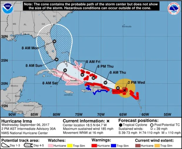 国家气象局迈阿密分局的最新预测表示,“到周五晚上,强飓风厄玛将接近南佛罗里达州。此时,国家飓风中心预测厄玛将以四级飓风的强度靠近或可能经过南佛罗里达。”在此之前,飓风厄玛目前的最大持续风速为185英里每小时,预计将继续向西移动,今天可能会擦过波多黎各北部,周四则可能经过多米尼加共和国。除了强烈的风外,它还带来了严重的风暴潮威胁,根据国家飓风中心的说法,沿着多米尼加共和国北部海岸将出现“高达五英尺的大型和破坏性波浪”,而在东南巴哈马则可能达到20英尺。