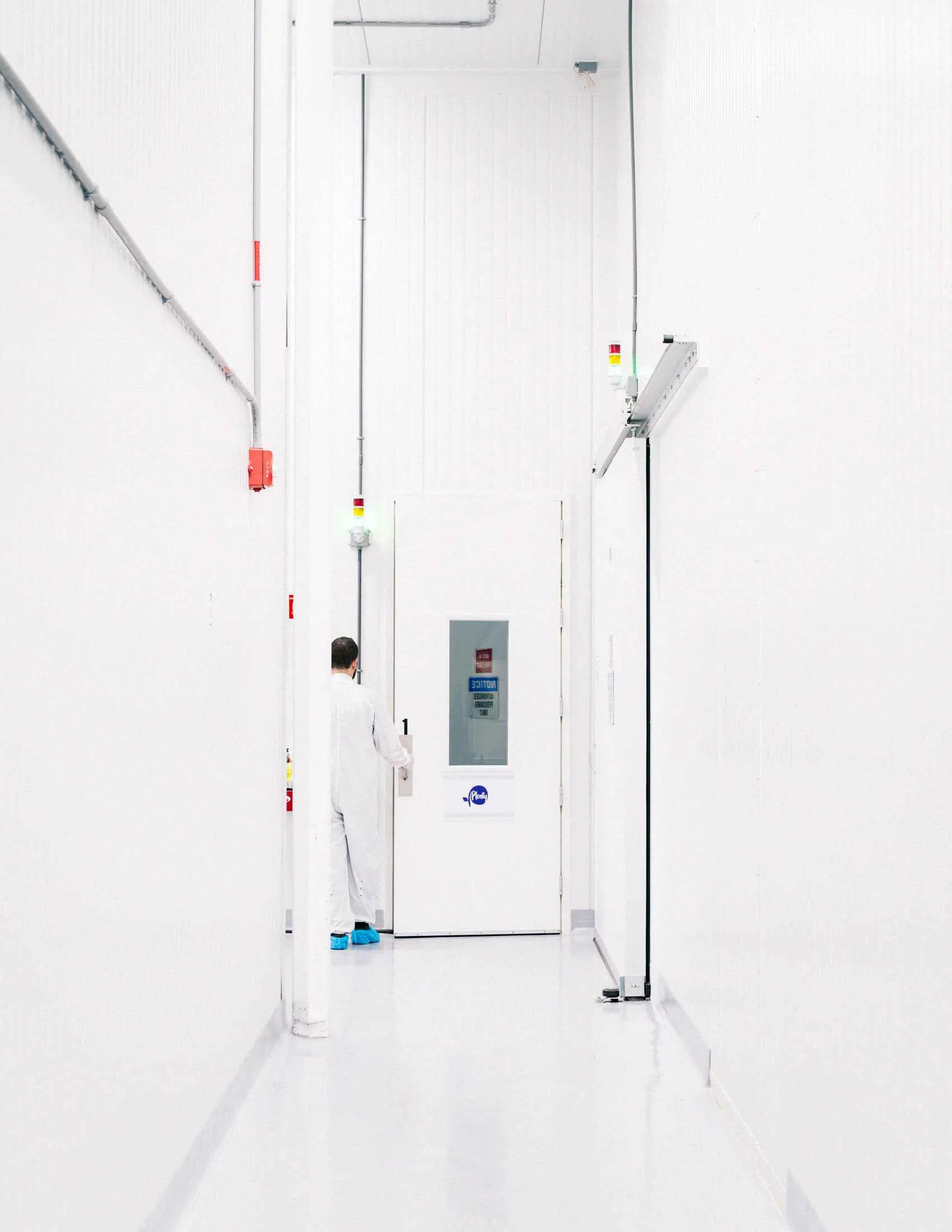 你的第一站是清洁室。打开门,空气会在你身后呼啸而过,带走多余的灰尘和污染物,门随之关上。滑入一套白色连体衣,穿上一次性鞋套,戴上带有彩色镜片的眼镜。在水槽里洗手,然后戴上食品安全手套。踩入一池清澈、经过消毒的液体,然后打开公司称之为室内种植室的门,那里又有一层空气浴消除在清洁室中收集的任何杂质。