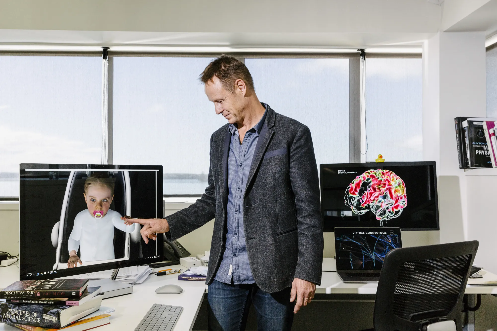萨加尔 和 BabyX 在灵魂机器公司的奥克兰办公室。
