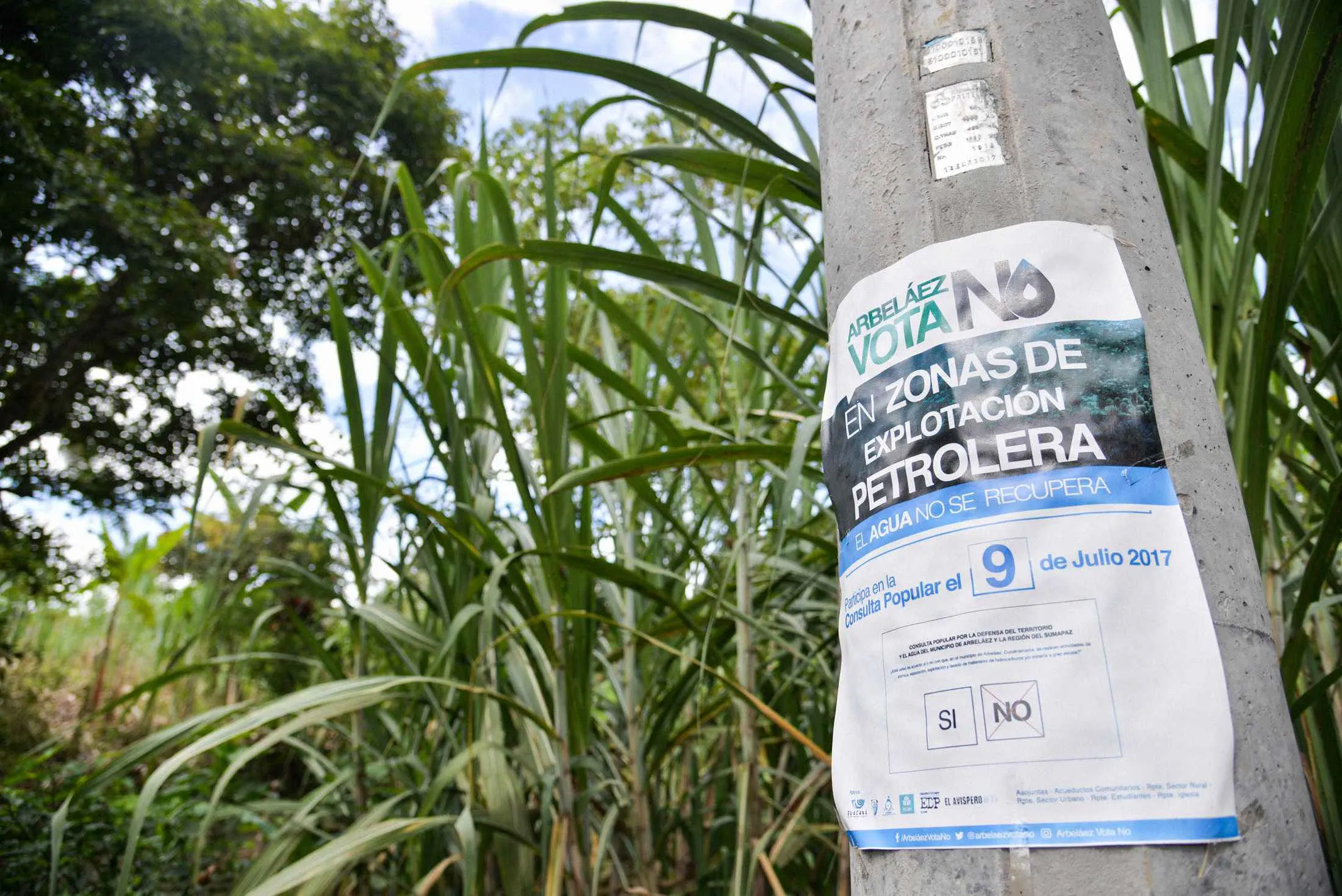 哥伦比亚阿尔贝拉埃斯的涂鸦鼓励当地人投票反对一个石油项目,以保护环境。