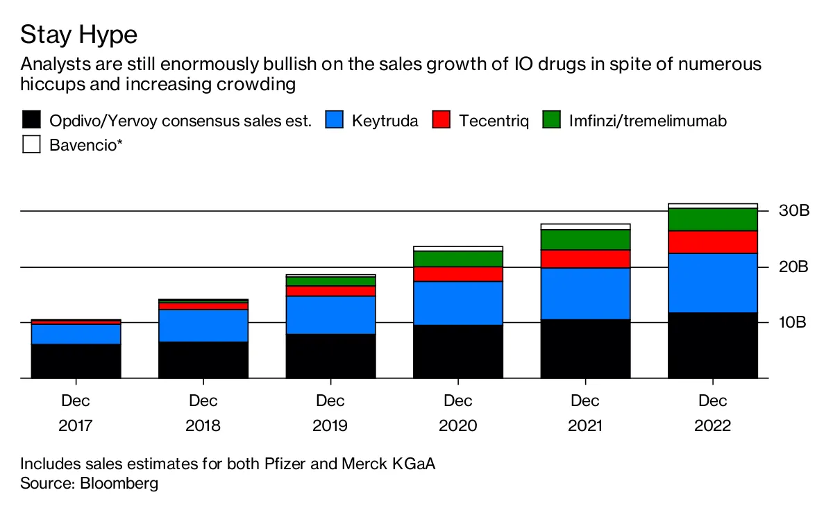 华尔街分析师预计,所谓的免疫肿瘤学(IO)药物到2022年将产生超过300亿美元的年销售额。五家在市场上拥有领先IO药物的制药公司正在大量投入试验,将其与其他药物结合,以期扩大其使用。