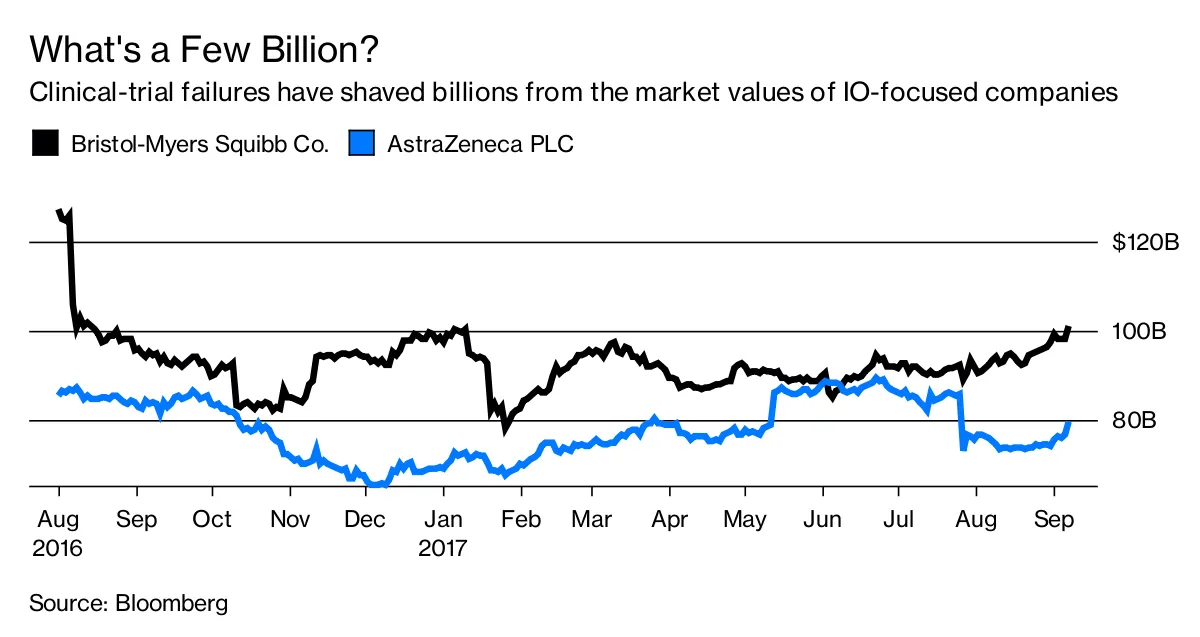而且其他风险依然存在。7 月,FDA 停止了默克公司与 Celgene 公司药物联合使用的 IO 药物 Keytruda 在多发性骨髓瘤中的测试,因为一系列患者死亡。本周,该机构要求暂停其他与 AstraZeneca、罗氏控股公司和布里斯托尔的 IO 药物联合使用的血癌组合。