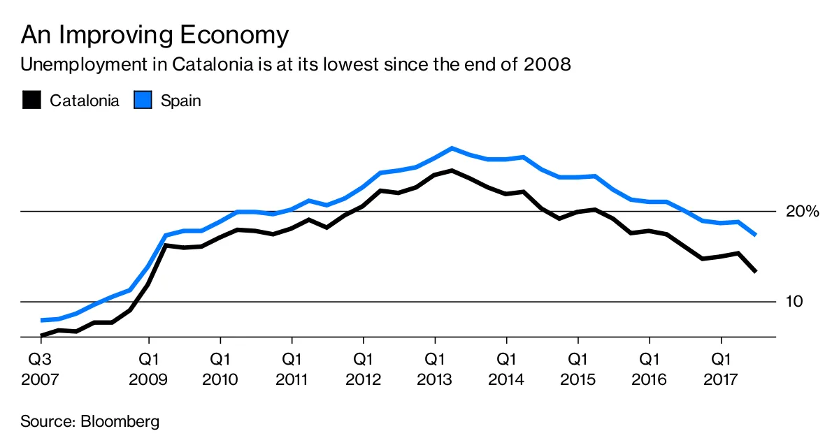 上升的经济潮流正在帮助沉没分裂主义者的船只。加泰罗尼亚几乎占西班牙国内生产总值的五分之一,是该国较富裕的地区之一。失业率在2013年初达到了24%的峰值;现在降至仅13%,低于全国整体的17%。