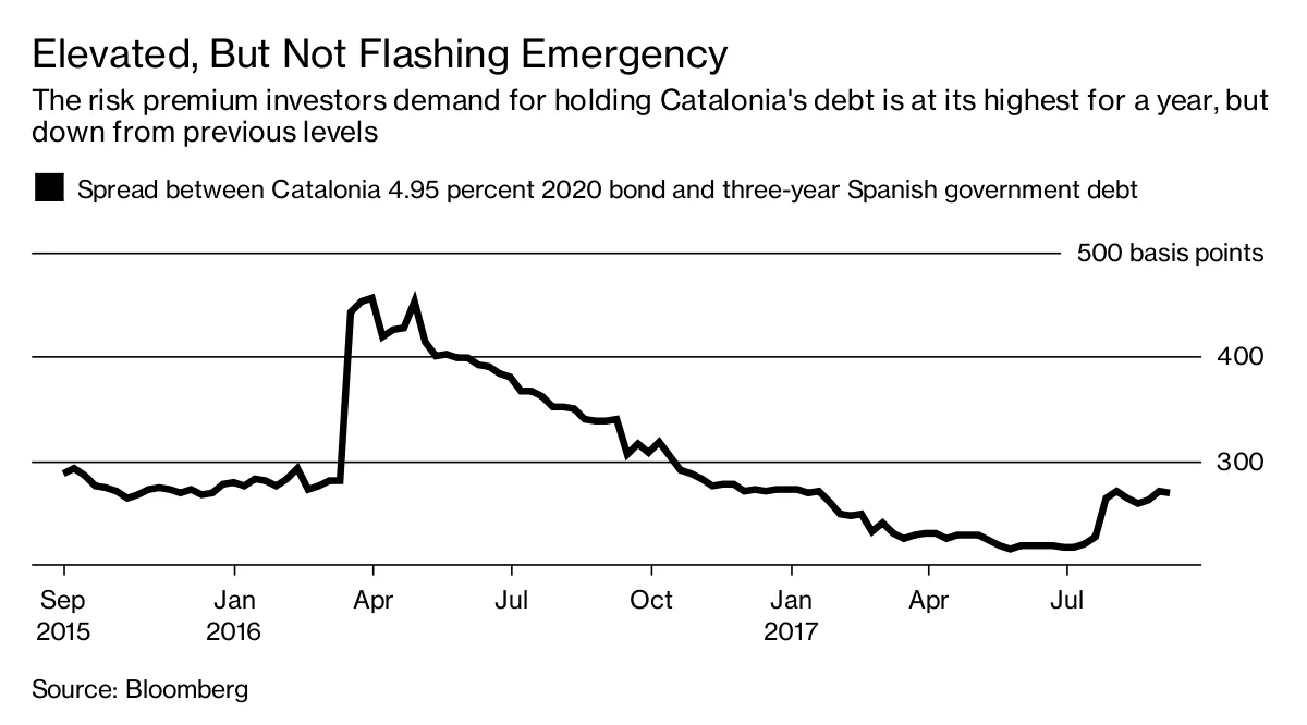 分裂几乎肯定意味着加泰罗尼亚将承担西班牙1.2万亿欧元(1.4万亿美元)的债务,增加其已经欠债权人的60亿欧元。但尽管该地区基准债券与西班牙政府债务之间的收益率差在最近几周有所上升,但仍远低于去年初的水平。