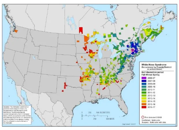 这种疾病是从欧洲引入北美的,在欧洲对旧世界的蝙蝠并不致命。WNS大约十年前在纽约的一个洞穴中首次被发现,此后向各个方向传播,造成至少七百万只蝙蝠死亡,数字还在增加。现在它已经在至少31个州和五个加拿大省份中出现。两个曾经强壮的物种,小棕蝙蝠和三色蝙蝠,现在正在评估是否符合濒危物种法。一些保护主义者称WNS为“北美历史上最严重的野生动物疾病爆发。”