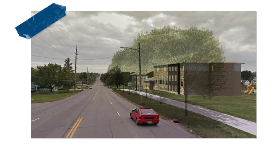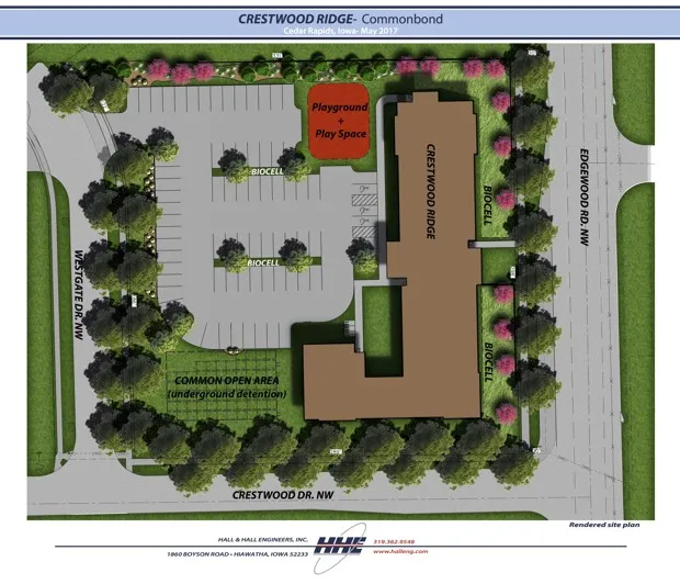 Crestwood Ridge 公寓的最新设计,展示了一些改进,例如游乐场和地下蓄水系统。CommonBond CommunitiesCommonBond 决定尽其所能推动项目进展。它提交了另一个提案,包括一些改进,例如在小区内设置转弯车道以减缓下坡的交通,提供儿童上学的步道,游乐场,以及一个将收集并缓慢释放雨水的地下蓄水系统。人行道和转弯车道将由市政府管理,但 CommonBond 将为其支付费用。