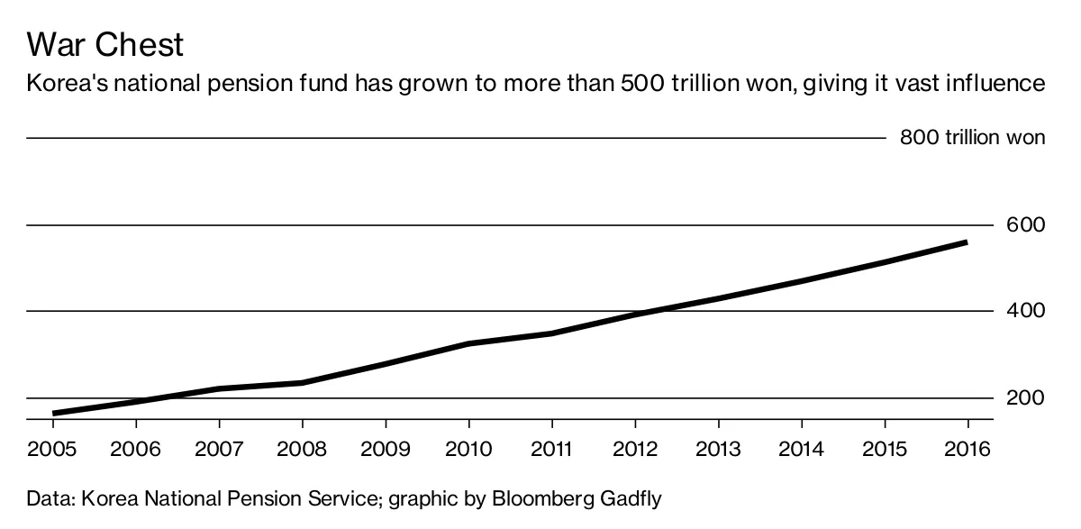 由于大多数工人必须向该基金缴纳费用,韩国的退休金储备已激增至2200万名贡献者和558.3万亿韩元(4950亿美元)的管理资产去年,相比2006年的189.6万亿韩元,使其成为仅次于日本和挪威的全球第三大养老金基金。