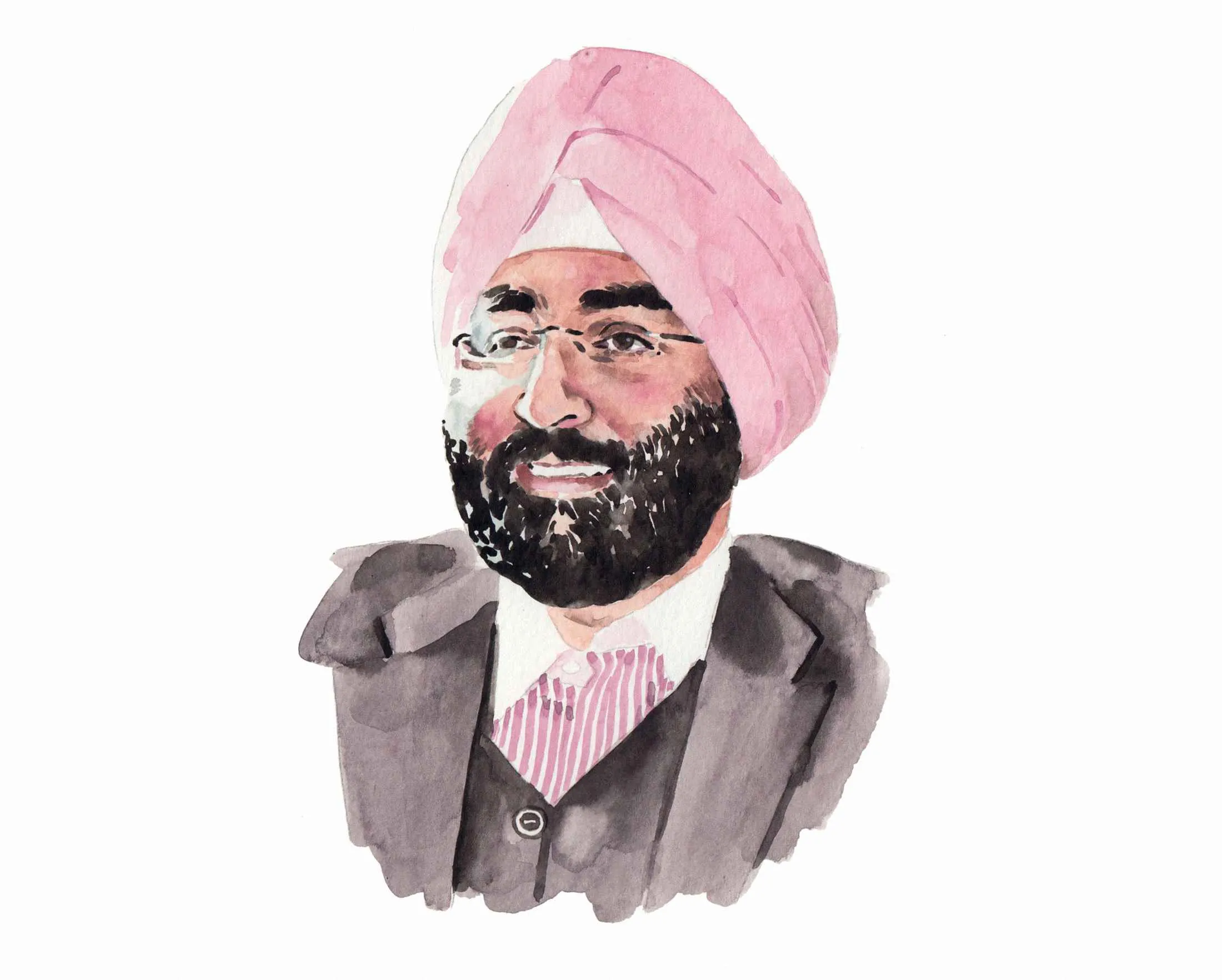 首先是他的头饰。巴赫尔是一名虔诚的锡克教徒,他所戴的头巾,无论是橙色、红色还是婴儿蓝,总是与他的商务服装完美搭配,甚至与他的领带和袜子相匹配。