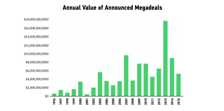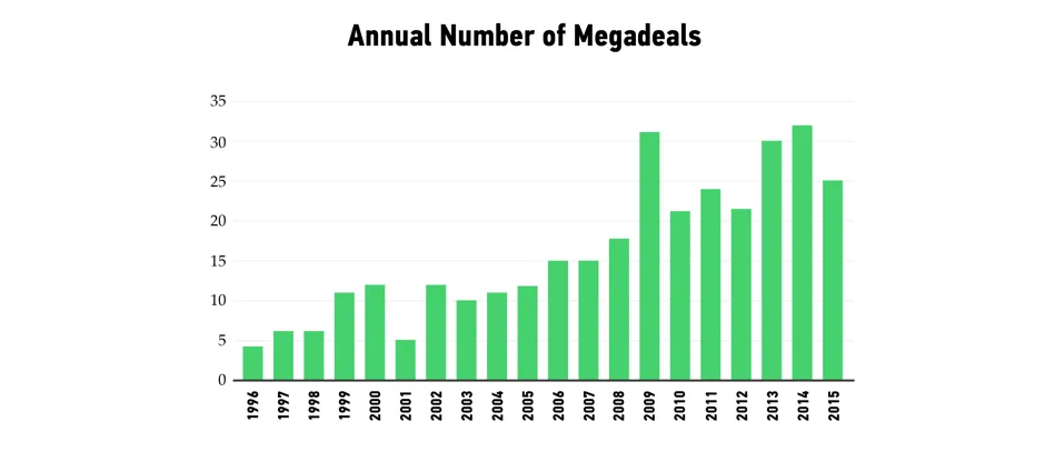 在2007年之前,每年通常少于十宗超级交易,但自2008年以来,这一比例已翻倍,平均达到25宗。