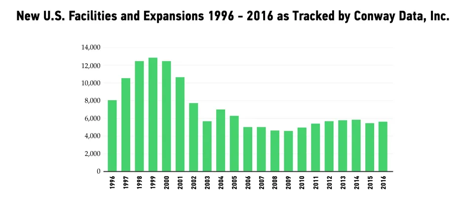 鲜为人知的是,州和地方可以竞争的经济发展交易的总供应量在大萧条之前就严重崩溃。下面的图表是我们对总交易的汇编(不一定是激励交易,而是由Conway Data, Inc.为其《选址》杂志的年度州长杯奖追踪的各种设施开设或扩展)。