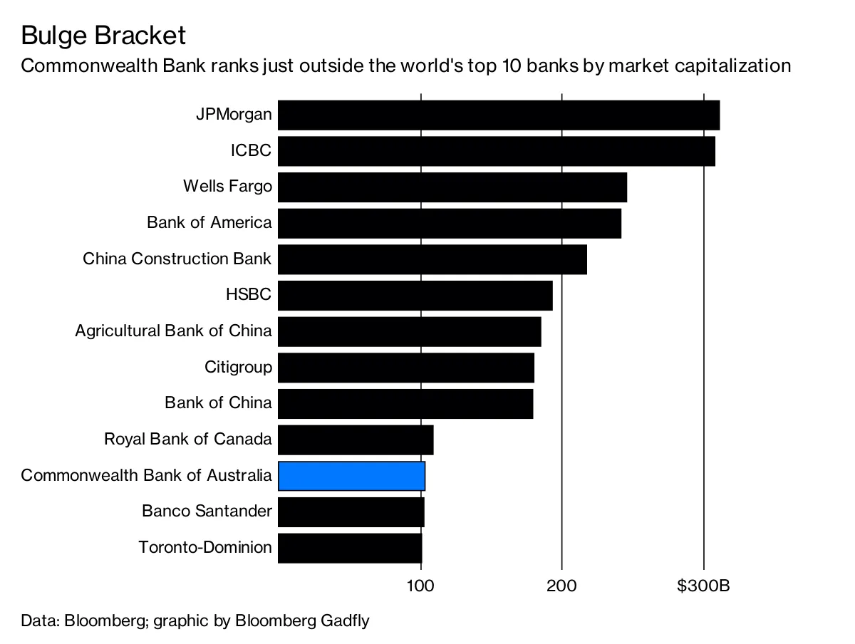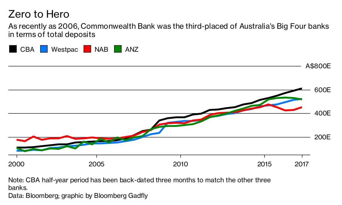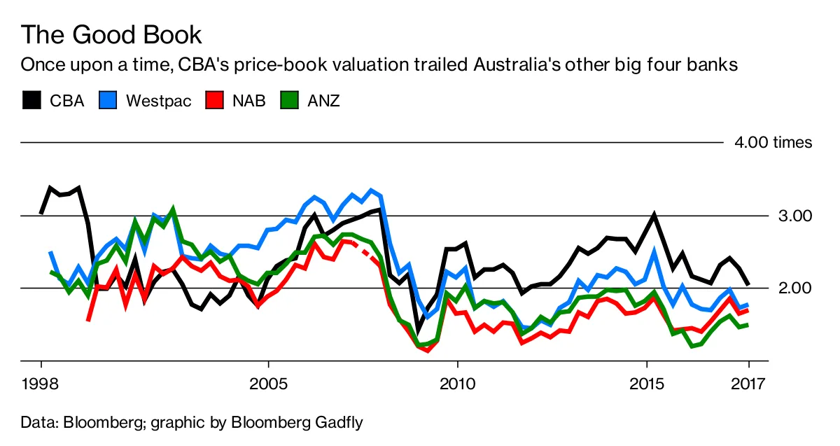 CBA在过去十年中表现良好,成为澳大利亚的默认贷款机构,作为一家前国有中央银行,它占据了大部分消费者存款和贷款。但不久之前,它在这两个方面都排名第三,市净率估值落后于竞争对手。