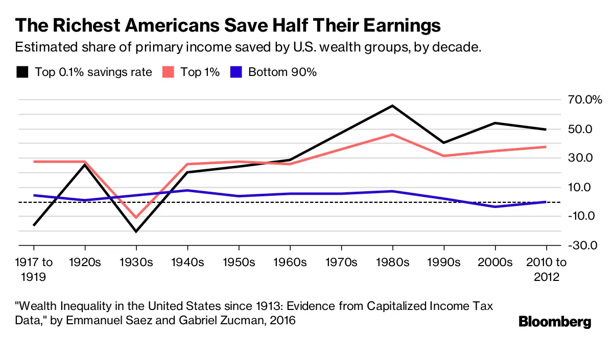 因此,消除NIIT或降低其他投资税,归根结底是通过让富人更多地储蓄和投资来刺激经济。但富人已经在储蓄——很多。Saez和他的伯克利同事Gabriel Zucman计算出,自1970年代以来,美国前1%的富人一直在储蓄超过30%的收入。