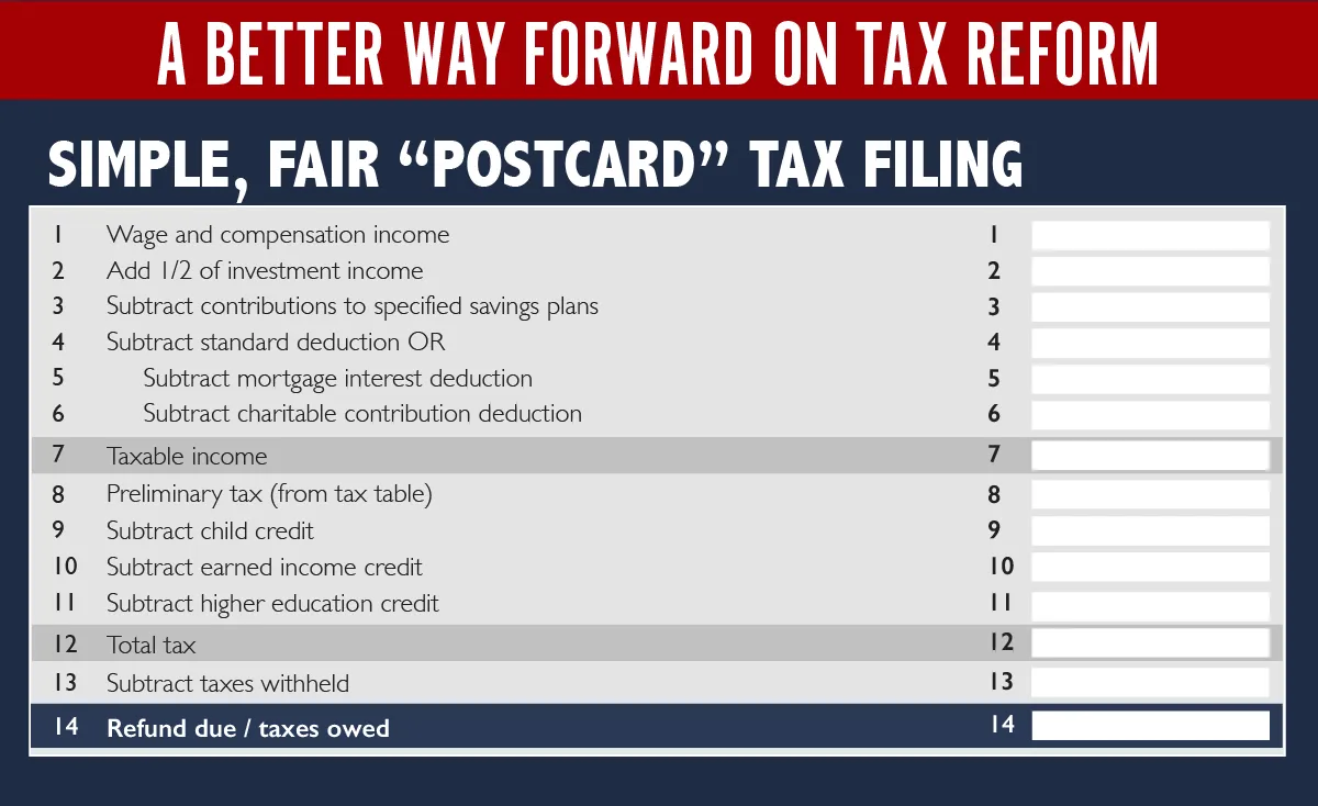 一个关键目标是“简化[税]法,使你可以在明信片上填写你的税务”,众议院议长保罗·瑞安在8月21日的CNN上说。虽然提议的税制改革的其他细节仍然模糊,但瑞安和其他共和党人一直在社交媒体上推广那张明信片的草案。