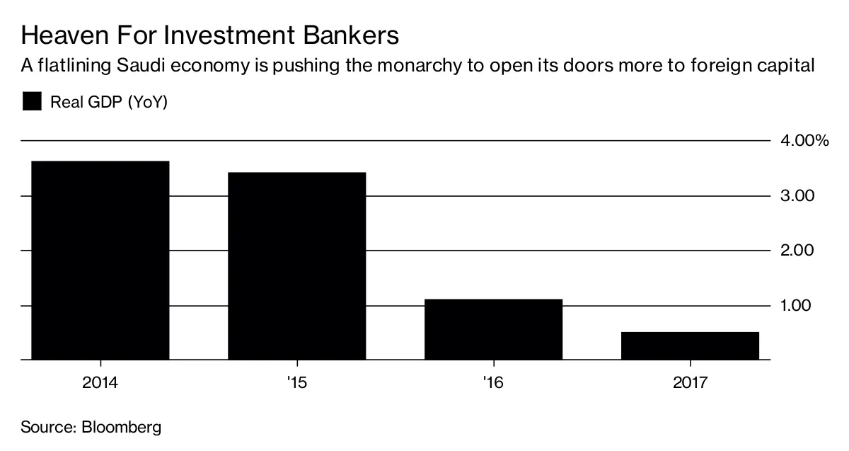 这反映了资本市场的利益——一个希望借更多钱和花更多钱的国家——并不总意味着经济更健康。自2014年以来,油价一直停滞在60美元以下,压缩了沙特的国家财政和其慷慨的从摇篮到坟墓的补贴,过剩供应的祸害预计将持续多年。根据国际货币基金组织的说法,沙特今年的增长将停滞不前。