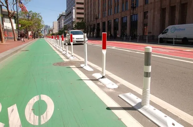 这座城市想要找到更耐用的东西,因此在市中心的市场街沿着自行车道安装了一条测试轨道,使用了四种不同的柱子。它们是(*交通迷警报*)一个带有TG路缘的Pexco FG 300柱,一个Impact Recovery Systems Tuff路缘,一个Impact Recovery Systems Tuff路缘XLP,以及一个Endoto EveluxUSA柔性柱和通道器。“它们已经在路上使用了五个月,我们没有遇到任何上述产品的问题,”SFMTA发言人本·何塞说。“工作人员根据以下标准决定未来继续使用Pexco柱:1. 最便宜,2. 最容易安装,3. 有可互换的零件。”