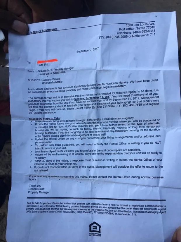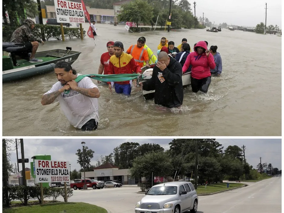 在这张照片组合中,撤离者在2017年8月28日的休斯顿Tidwell路上涉水而行,顶部,热带风暴哈维的洪水上涨,而一辆车在9月5日的同一路段上行驶,底部,水位已退。大卫·J·菲利普/AP希尔顿·凯利在过去几天里在Facebook Live上发声,谈论那些为了逃避哈维飓风而撤离家园的家庭,现在却收到了驱逐通知。这些家庭住在德克萨斯州的波特阿瑟,这个小型海湾城市距离休斯顿约90英里,但目前分散在路易斯安那州和德克萨斯州。凯利本人也不得不撤离——这是他在过去15年中因飓风洪水而进行的第四次撤离——但他上周能够回到家中。他现在试图通过社交媒体找到尽可能多的分散家庭,以了解谁没有回来以及原因。这时他才发现了驱逐通知。