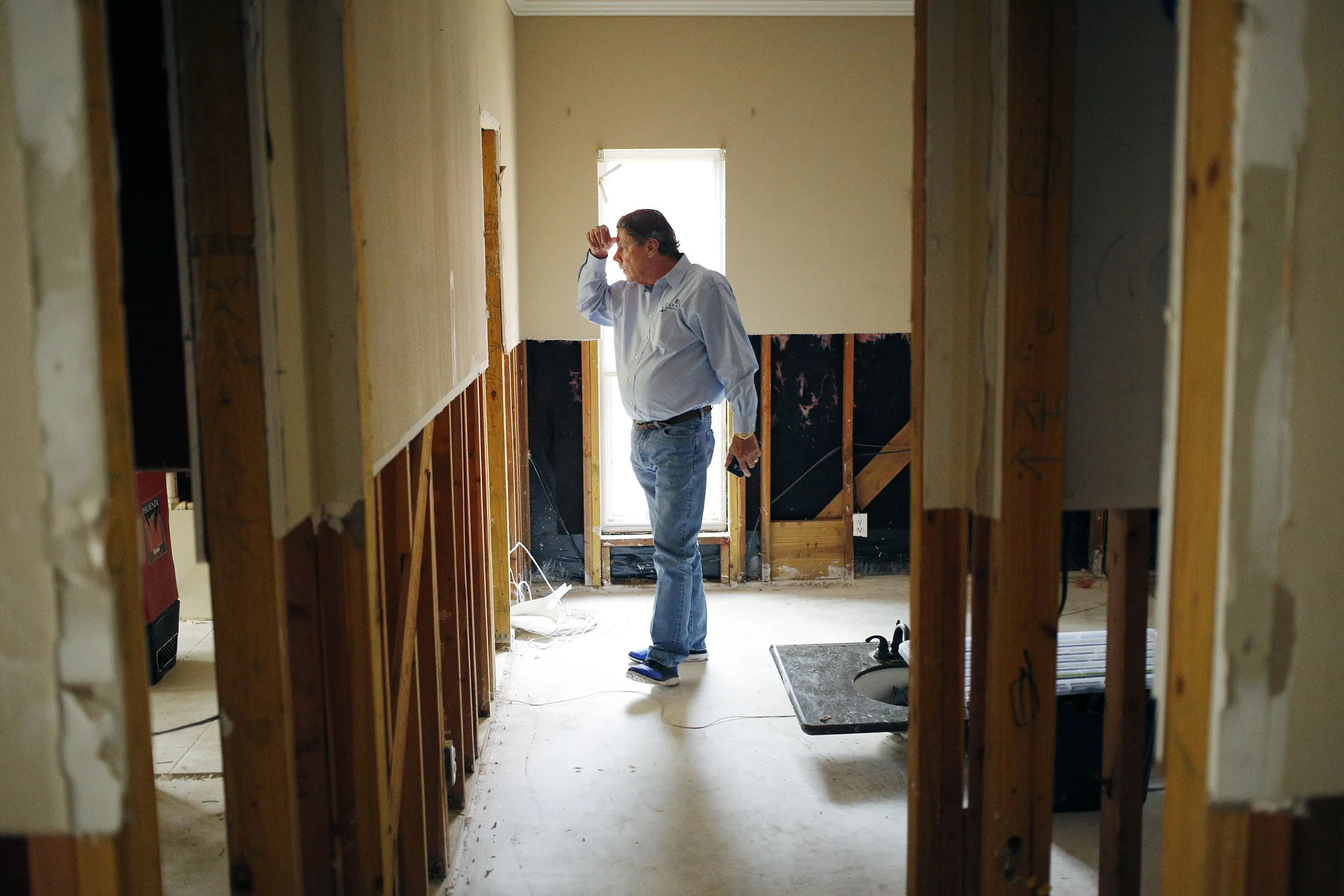 弗兰克·琼斯,骑兵建筑公司的老板,站在2017年9月6日在德克萨斯州春季被哈维飓风淹没的房子里。