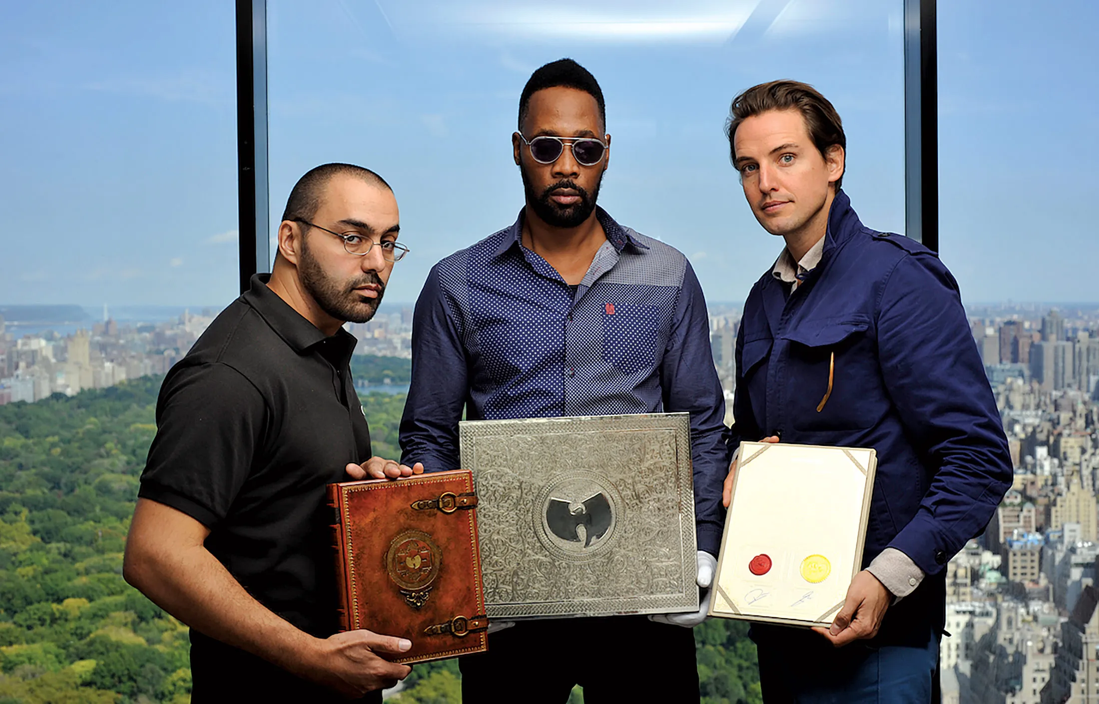 Cilvaringz、RZA 和 Paddle8 的联合创始人 Alexander Gilkes 手持随专辑附带的书籍、盒子和认证。来源:Paddle8Killa Sin 和 U-God 及 Method Man 的代表的说法与在嘻哈网站上流传的故事相呼应: 在少林寺的故事 最初是 Cilvaringz 的一个项目,他后来说服了 Wu-Tang Clan 的实际领导者 RZA 支持该项目,使这张专辑更具价值。(RZA 和他的代表没有回应采访请求。)