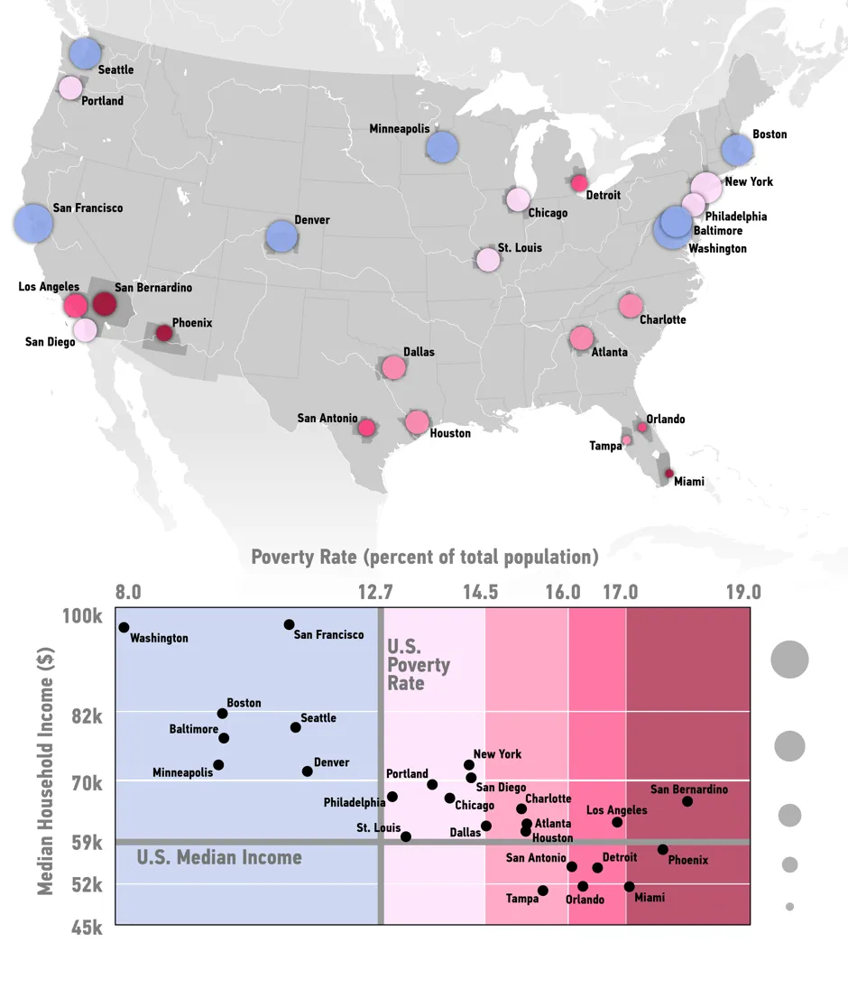 在这些城市中,差异相当明显。旧金山的中位收入为$96,667,是最高的,而坦帕的中位收入为$51,115,是最低的。一般来说,南方的大城市往往收入较低,贫困水平较高。
