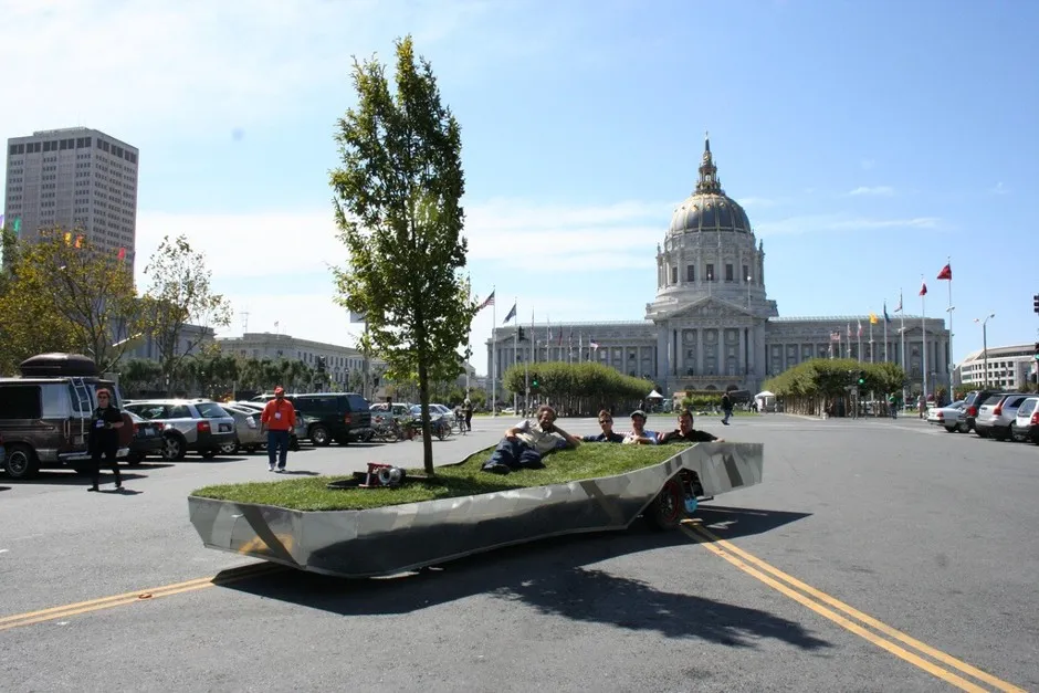 约翰·贝拉、布莱恩·梅尔克和马修·帕斯莫尔,Park(ing) Day的创始人,与艺术家鲁本·马戈林在2007年的Park(ing) Day上,站在旧金山市政厅前约翰·贝拉提供“我喜欢把Park(ing) Day的装置看作城市转型的入门药物,”约翰·贝拉说。