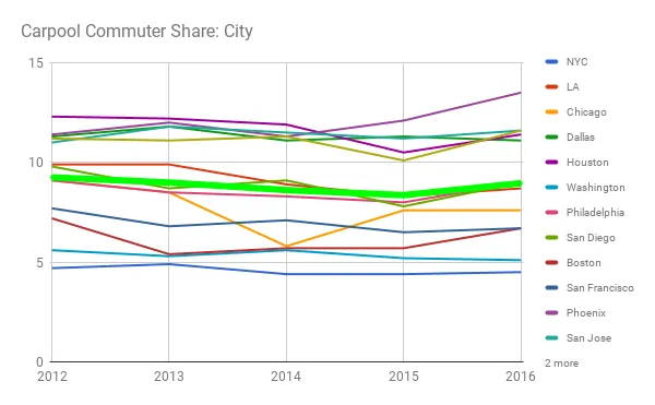 这是对该列表的一个初步补充:拼车。新的普查数据于周四发布显示,报告共享通勤的工人比例在美国多个主要城市有所上升。