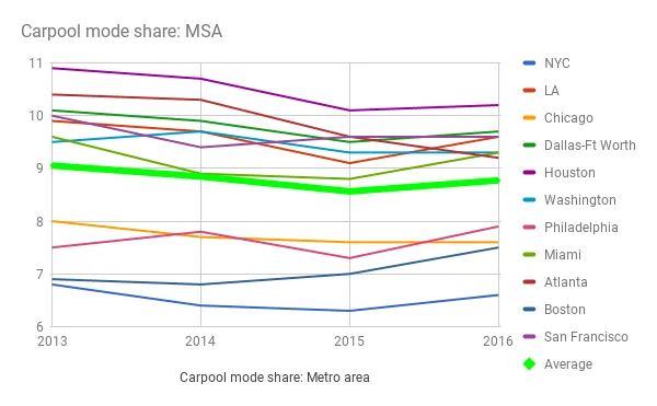 城市实验室/人口普查/谷歌图表按市政边界测量大型美国城市,拼车模式份额的上升趋势线看起来更为明显: