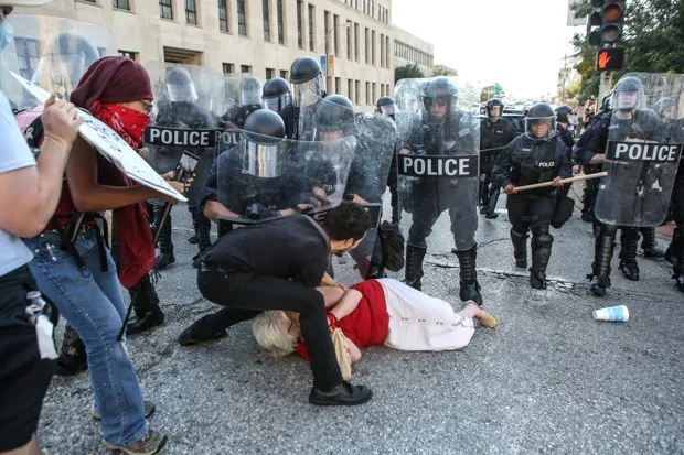 一名被警方推倒的女性在抗议者的帮助下,警方试图驱散人群。劳伦斯·布莱恩特/路透社密苏里州州长埃里克·格里滕斯(共和党)对前州长杰伊·尼克松(民主党)处理弗格森抗议活动的方式表示批评。格里滕斯称弗格森抗议活动的处理是“失败领导”的一个例子,并表示密苏里州因此在全球“受到羞辱”。格里滕斯在裁决前与当地神职人员会面,并表示他“致力于保护”抗议的宪法权利。
