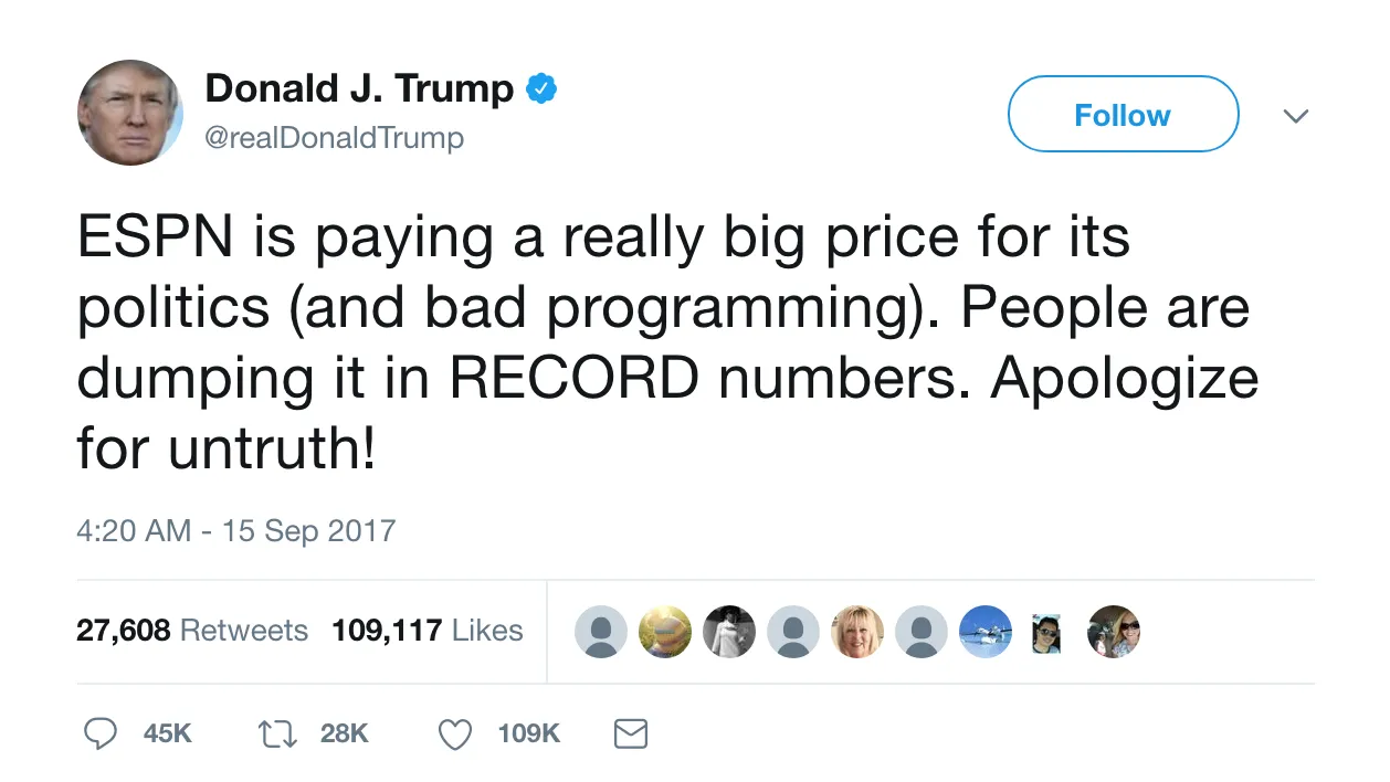 最近几乎可以为ESPN感到遗憾。它所做的一切都引发了愤怒。今年二月,当该网络在其平日晚上6点的时段进行人员调整时,这似乎并不是一个会引发全国性争议和美国总统要求道歉的举动。但现在我们就在这里。上周五,在关于打击ISIS和移民政策的声明之间,特朗普总统发了这样的推文: