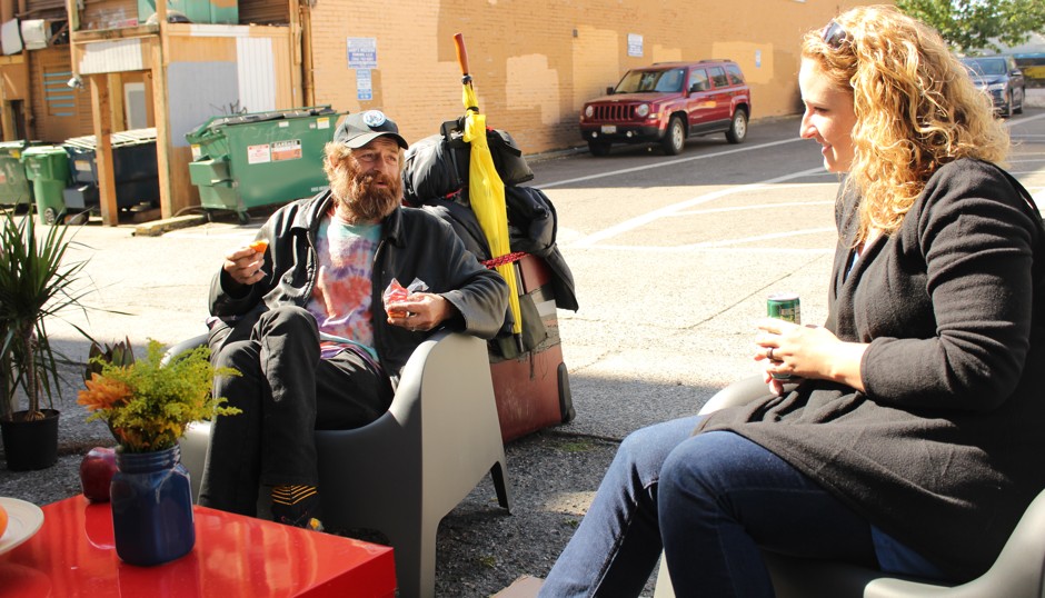 “我希望我有一个这样的客厅,”54岁的史蒂文·施密特说,他在西雅图的街头生活了超过20年。他仅靠社会保障残疾补助和乞讨维生。他缺少一根肋骨,有神经损伤和神经病,这使他无法舒适地站立超过30分钟。他的无家可归服务案例经理向他保证,他很快就会得到第8节住房,但为他的宠物雪貂找地方却成了一个障碍。在一个普通的工作日,他说,他可能会在杂货店外乞讨零钱。但在阳光明媚的日子里,(客厅)项目的设施显得格外诱人。