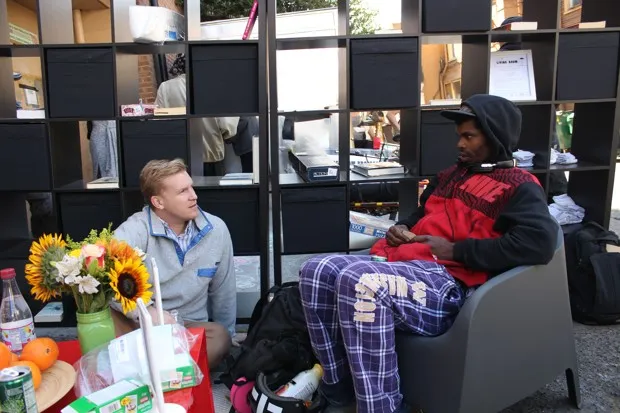 这是一个户外客厅,足够宽敞,可以容纳十几个人聚会。路过的人们啃着免费的三明治,聊天,翻阅杂志。一个家伙在他的iPod上放着迈克尔·杰克逊的音乐。另一个人在角落里安静地打盹。他们的背包里装满了帐篷和露营用品,滚动的行李箱外面绑着雨伞和衣物。显然,这里大多数人都是无家可归者。