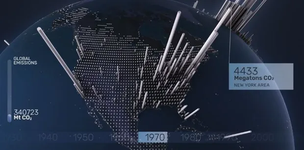 可视化从1760年伦敦周围一个小白点开始——工业革命的开始。工业革命。更多白点迅速出现在整个欧洲,在19世纪中叶巴黎和布鲁塞尔显著上升,然后在整个亚洲和美国,在20世纪初,纽约地区、芝加哥和南加州的排放量激增。