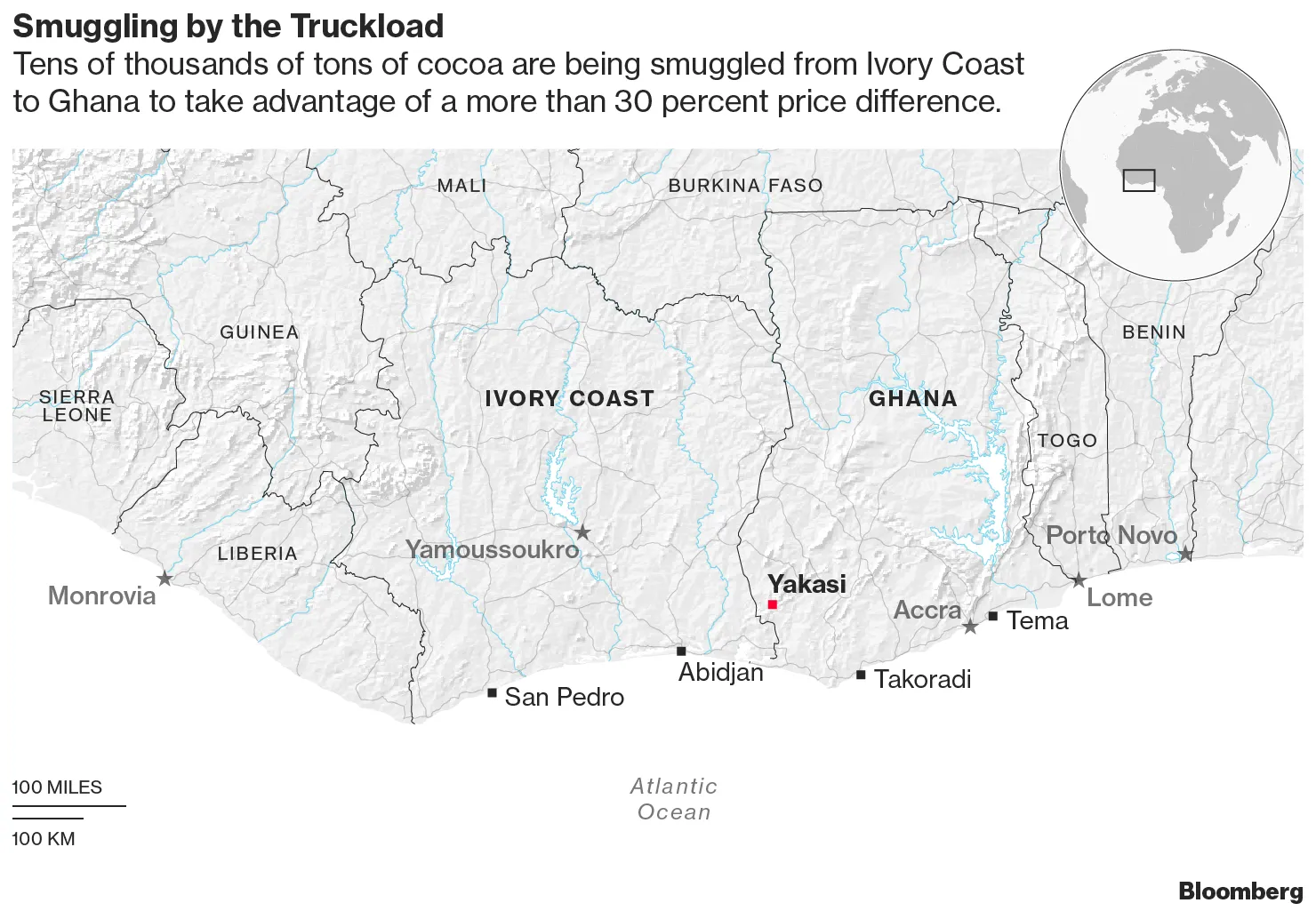 由于提供全球60%可可的国家之间的非法交易规模几乎不可能监控,因为它们的边界非常松散。象牙海岸的可可监管机构估计,本季约有70,000吨豆子被走私到加纳,相当于加纳年产量的至少7%。熟悉这一交易的人预测,这一数字将在下一个作物季节翻倍。