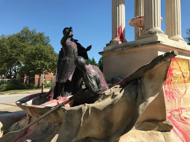 弗朗西斯·斯科特·基的纪念碑成为抗议者的目标。这并不是这座雕像第一次面临批评。埃利·普森位于巴尔的摩的基纪念碑,一座弗朗西斯·斯科特·基的青铜雕像,站在一艘大理石船上,自1911年以来一直矗立在该市的尤塔广场社区。上周三早上6:30,巴尔的摩市公园和娱乐部的工作人员发现它被鲜红色的油漆泼洒。喷涂在基旁边的大理石柱子上的字样是“种族主义国歌”。