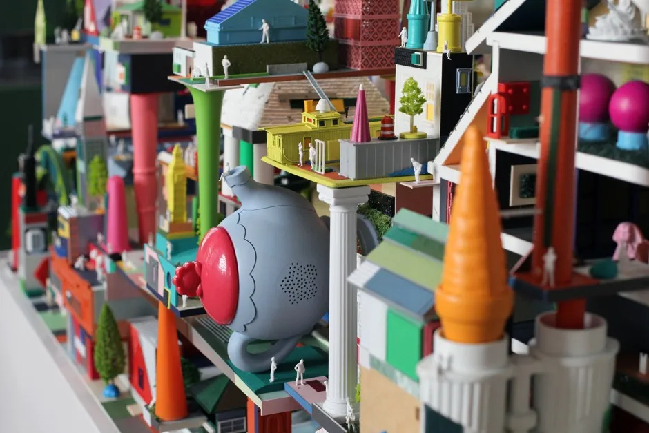 “集体生活提案 II(致敬约翰·索恩爵士)”的安装视图科瓦奇办公室在一个塑料塔顶上有一个雪球穹顶,这既是对被认为是适当建筑材料的冒犯,也是对设计创作过程的冒犯,因为它自由而毫不掩饰地借鉴他人。单独来看,每个组件都是陈腐的。但就像普赖斯纳和安德森的釉面砖一样,它们很容易让人们在自己的生活中识别出来,尤其是著名建筑的玩具模型,比如埃菲尔铁塔——“非建筑师所认知的建筑的东西,”科瓦奇说。