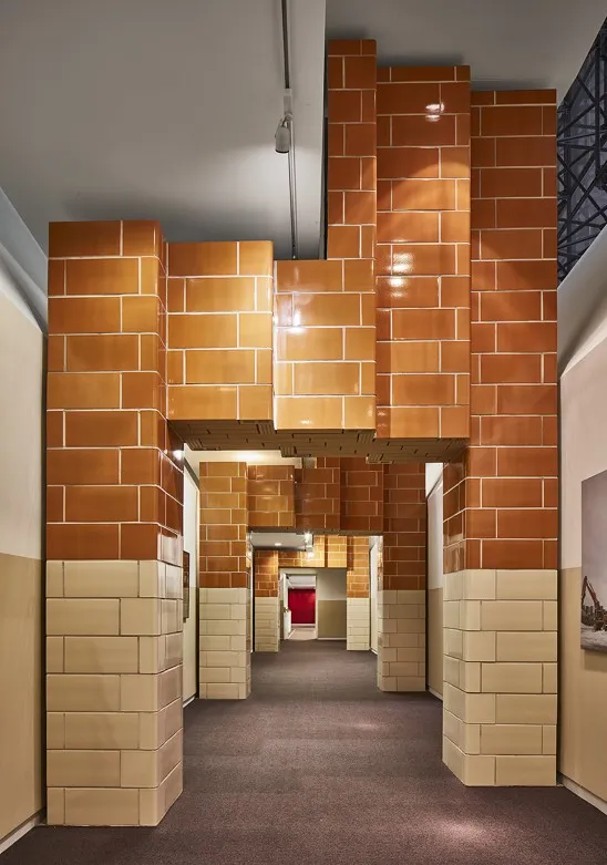 J. MAYER H. 和合作伙伴,建筑师与菲利普·乌尔斯平,“宇宙拿铁:米色宣言”的装置视图,感谢芝加哥建筑双年展肯达尔·麦考赫提 © 霍尔·梅里克摄影师在 2017年芝加哥建筑双年展 中最具情感共鸣的展览之一是一个安静的展览:在走廊中的一组淡棕色釉面瓷砖拱门。这些拱门形成了一种柱廊,更好地定义了一个过宽的走廊但又过窄的画廊空间。