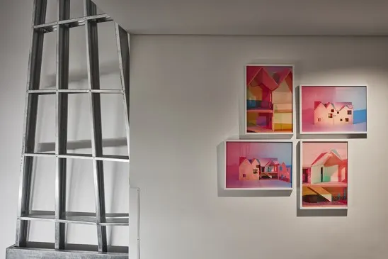 Schaerer 的灰色二维屋顶描绘在“MALL”的“玩偶屋”中获得了彩虹色的对比由 MALL 提供。这些玩偶比例的郊区豪宅木模型的照片沐浴在霓虹灯下,交错的紫色、橙色和蓝色带子为其增添了一层几何深度。奇特的山形屋顶线将这个粉色的游乐场甜点转向前卫的抽象。它们有些 不对劲。“我所创造的形态是可识别的,但它们比现有状态更奇异,”MALL 的 Jennifer Bonner 说。