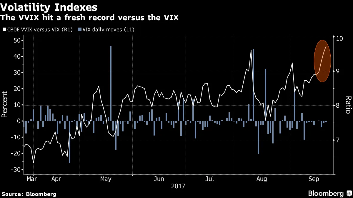 彭博社商业周刊大学橄榄球需要向大联盟棒球学习一课销售比职业选手更多棒球棒的影响者兄弟们谁认为中国不是经济强国?中国2024年印刷杂志的复兴波动性是波动的像周一这样的日子帮助解释为什么关于低波动性是否是自满的迹象的辩论有点误导。尽管根据CBOE波动率指数(VIX)测量,目前的波动性处于低迷状态,但交易员们并不期望它会保持这种状态。这可以从CBOE VVIX指数中看出,该指数是VIX的隐含波动性。根据彭博新闻的塞西尔·瓦努奇,两者之间的比率刚刚达到新高。自8月9日的最后一个峰值以来,VIX在四个不同的日子里波动超过20%,包括8月10日的44%的激增。同时,受益于市场平静的交易所交易产品刚刚经历了有记录以来最大的每周资金流出,而那些在股票波动加大时获利的产品则吸引了更多资金。不过,仅仅因为波动性上升并不意味着股票就注定要失败。在周一给客户的一份报告中,坎伯兰顾问公司表示,当比较标准普尔500指数的一年回报与VIX降至52周低点后的年回报时,他们发现两者之间没有统计显著性。